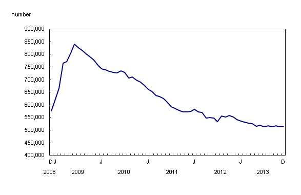 In December, 514,200 people received regular Employment Insurance (EI) benefits—little changed from November. The number of beneficiaries has been relatively stable since May 2013, following a long-term downward trend that began in the summer of 2009.
