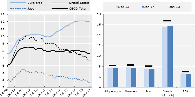 The OECD unemployment rate was stable at 7.6% in January 2014. Across the OECD area, 46.2 million persons were unemployed, 3.8 million less than the peak in April 2010, but 11.5 million more than in July 2008.