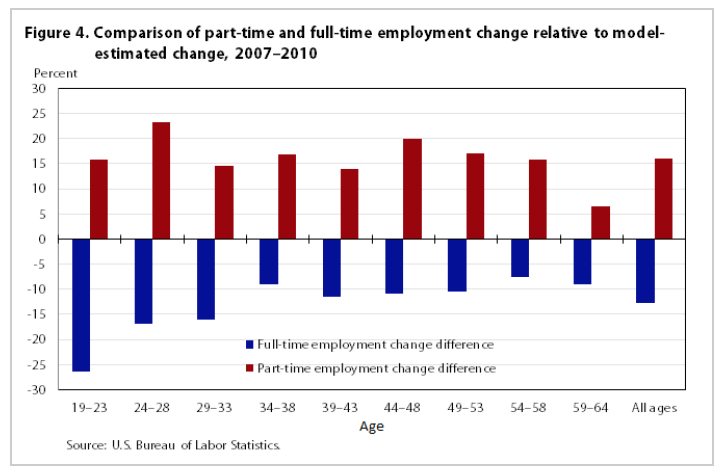 A model of employment change between 2007 and 2010 in the absence of the recession was compared with actual employment change as measured by the Current Population Survey. Not surprisingly, results show that actual employment was lower than the model predicted for all age groups; however, differences were much larger for younger workers. Full-time employment was much lower than the model predicted, while part-time employment was much higher. Actual employment change varied widely among occupation and industry groups, but nearly all groups had employment that was lower than the model predicted.