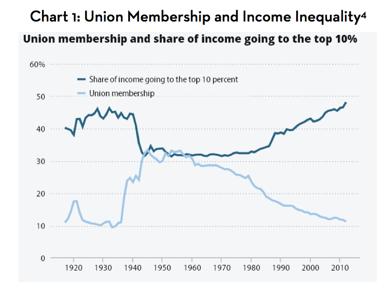 Higher wages and better benefits helped to build a huge middle class in the United States and to level income inequality. When union membership reached its peak between 1943 and 1958, income inequality dropped (Chart 1). The share of income that went to the wealthiest ten percent of Americans dropped to near 30 percent. But as the proportion of union members fell, the share of income taken by the wealthiest began to rise again. By 2010, the wealthiest were taking home almost 50 percent of the nation’s income.