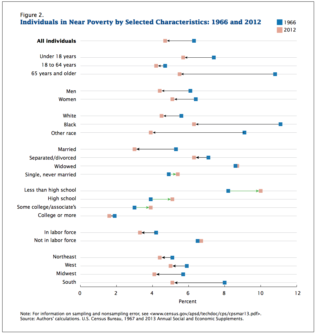Figure 2 shows the near-poverty rate for individuals by selected characteristics for 1966 (blue square) and 2012 (pink square). Arrows connect the squares to indicate the size and direction of the change. Black arrows represent a percentage point decrease from 1966 to 2012, while green arrows represent a percentage point increase from 1966 to 2012.