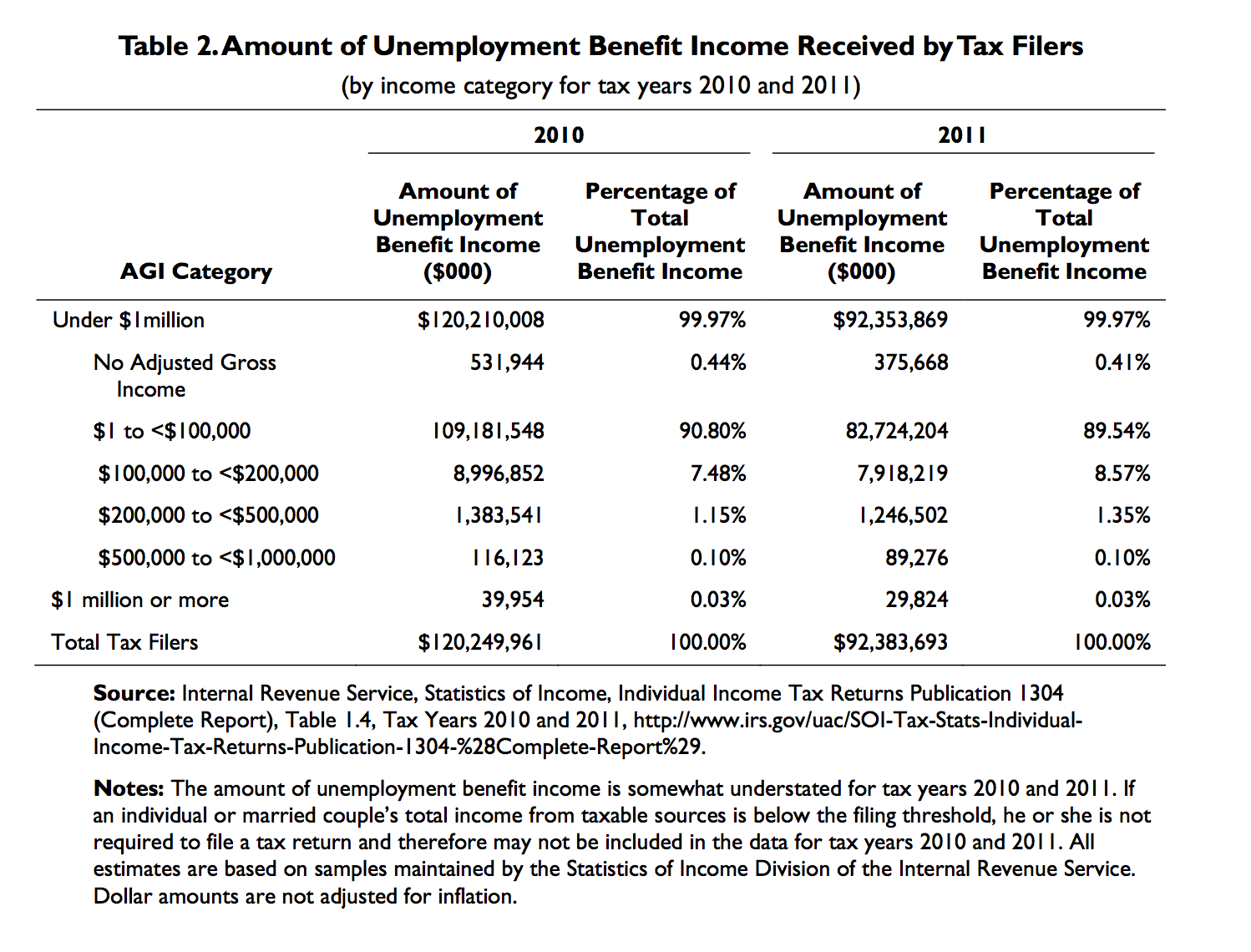 $1 million or more is relatively small. For tax year 2010, tax filers with at least $1 million in AGI reported receiving $40.0 million in unemployment benefit income, which represents 0.03% of total reported unemployment benefit income. Similarly, for tax year 2011, tax filers with at least $1 million in AGI reported receiving $29.8 million in unemployment benefit income, which also represents 0.03% of total reported unemployment benefit income.