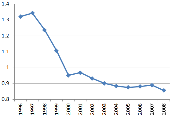 Figure 3 shows the values of matching efficiency on the vertical axis. From the figure, we see that matching efficiency in China declined sharply from the late 1990s to the 2000s.