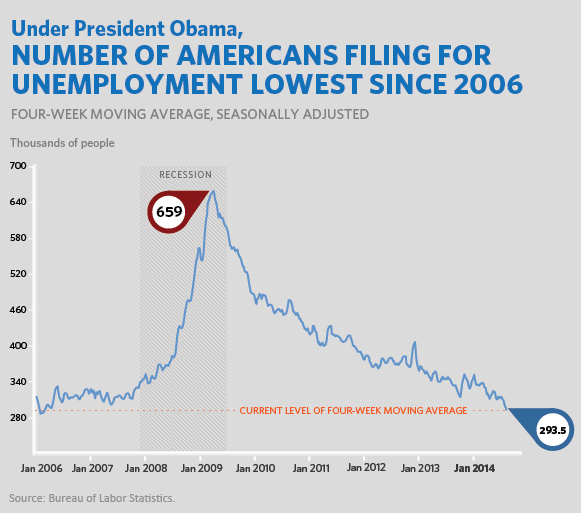 As the economy moves forward, the number of people who are applying for unemployment insurance is dropping. Just this week, the four-week moving average of initial claims for unemployment benefits hit their lowest level since 2006. And while this series can be volatile from week to week, a look at the longer-term picture shows the progress we have made. Take a look at where that number was during the Great Recession — and where we are now: