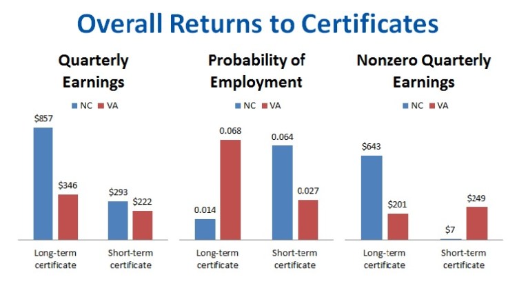 The researchers found both an earnings bump and a higher likelihood of employment for short-term certificate holders. For example, students in North Carolina earned an average of $1,172 more per year with a certificate of one year or less. They were 7 percent more likely to have a job. Those numbers were $888 and 3 percent for certificate holders in Virginia.
