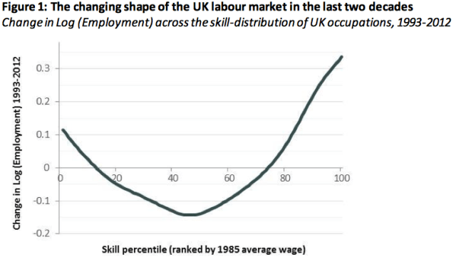 The Resolution Foundation’s report on job polarisation looked at the shift in jobs based on wage distribution. Rather than grouping jobs by a skill classification, they ranked them on the basis of mean hourly pay at the start of the period, then mapped the change over time.