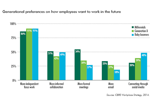 Designing the office of the future? Don’t plan it around (what you think you know about) U.S. millennials. The study, based on aggregated CBRE Workplace Strategy surveys from more than 5,500 office workers across numerous industries, found that while current assumptions about millennials are driving the design of many workplaces today, there is actually little difference in workplace preferences between millennials, Generation Xers and baby boomers.
