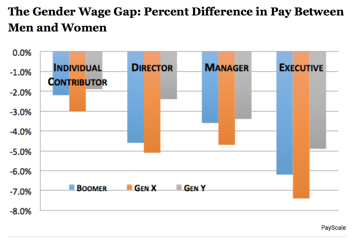 If that paragraph doesn’t entirely make sense to you, this graph should make things crystal clear. It comes from data in a new PayScale and Millennial Branding study. You can see Millennials (in grey) have the smallest gender-wage gap at all levels, but the difference in pay deepens as you move up the corporate ladder.