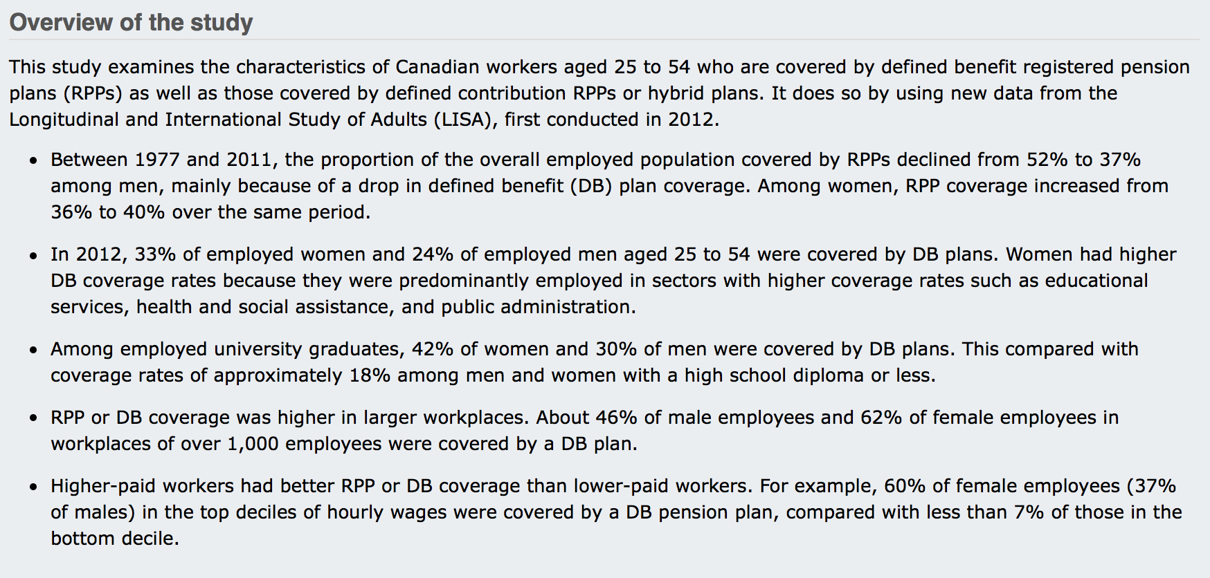 In 2012, one-third of employed women and one-quarter of employed men aged 25 to 54 were covered by a defined benefit (DB) pension plan. Women had higher coverage rates mostly because they were more likely than men to be employed in sectors with higher rates of pension coverage.
