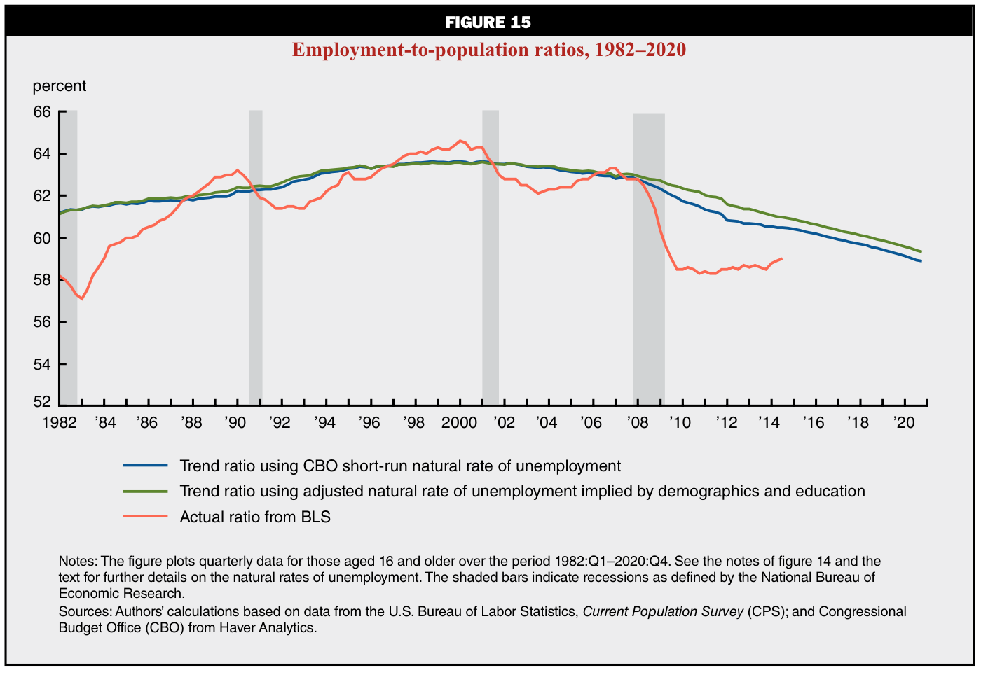 Figure 15 shows the implication of our trend LFP and natural rate of unemployment results for the trend employment-to-population ratio. As the figure shows, the trend employment-to-population ratio has been falling for over a decade because of the drop in the LFP rate. The value of the trend employment-to-population ratio using the CBO’s short-run natural rate of unemployment (blue line) is 60.5 percent in the third quarter of 2014—about 1.5 percentage points greater than the actual BLS data (orange line). Relative to the trend employment-to-population ratio using the adjusted hypothetical trend unemployment rate described in the previous paragraph (green line), the actual ratio is 2 percentage points lower in the third quarter of 2014.