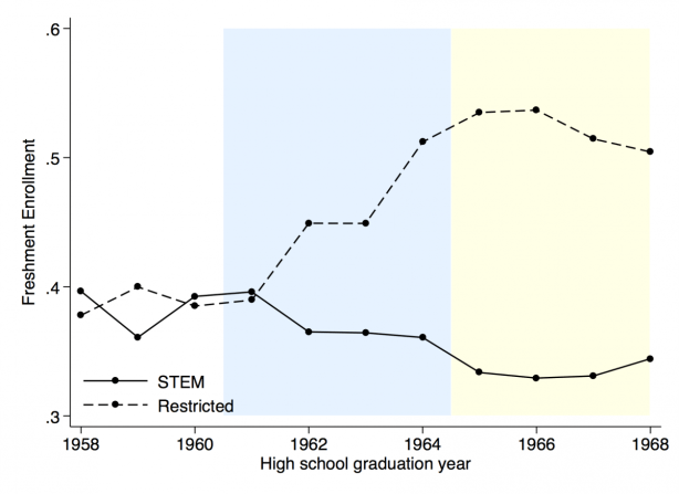 Figure 2 Cohort shares of students from university-prep high schools enrolling in university STEM majors and programs with restricted access after 1961