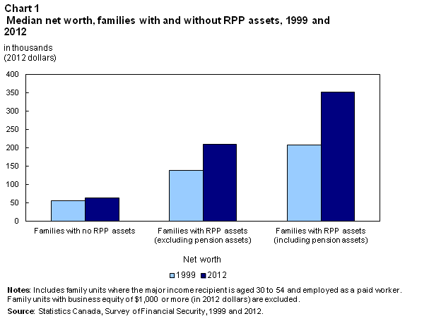 - Excluding pension assets, family units with RPP assets had a median net worth of $210,600 in 2012. This compared with a median net worth of $64,000 among family units without RPP assets.