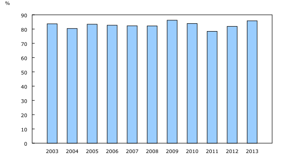 The rate of eligibility for receiving regular Employment Insurance (EI) benefits in 2013 was 85.8%, up from 81.9% in 2012.