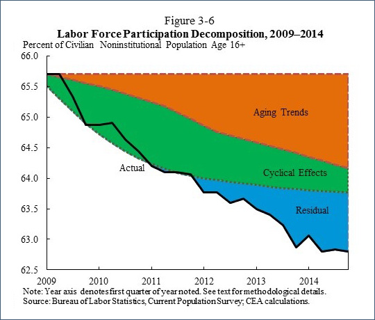 Chapter 3 of [The 2015 Economic Report of the President] addresses the opportunities and challenges facing the U.S. labor market. The sharp drop in unemployment in 2014 came amid a stabilization in the labor force participation rate and the strongest annual job growth since the 1990s as businesses added more than 3 million jobs. But economic performance must be gauged by more than just the unemployment rate — a successful job market also encourages labor force participation, supports quality jobs, and facilitates effective job matching of workers and positions. This chapter reviews the United States’ recent labor market progress and discusses five long-standing labor market challenges that motivate many of President Obama’s policy initiatives. The decline in the labor force participation rate earlier in this recovery is one such important challenge. Just over half the participation decline has been driven by an aging population as the “baby boomer” generation has begun to retire (Figure 3-6). Moreover, labor force participation has stabilized over the past year, indicating that the 2014 unemployment decline reflected strong job growth rather than a shrinking labor force.