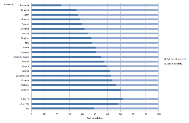 Similar analysis published by the European Commission suggests that across most EU countries, the chances of leaving poverty when taking up a job are lower than in the UK. In 2009, for the EU overall, just half (49%) of people left poverty when entering employment (Figure 1). Poverty exit rates varied considerably across countries, with just 23% and 35% of people leaving poverty when finding employment in Romania and Bulgaria respectively.