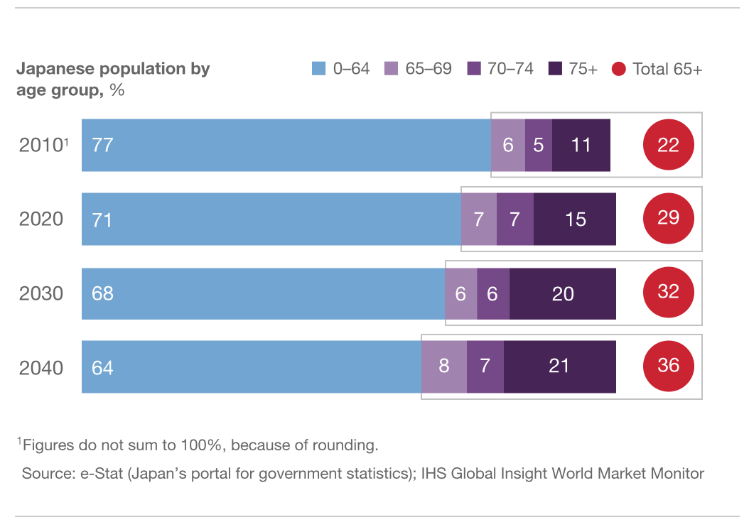 Japan is the world’s oldest country—25 percent of its people are aged 65 or over. By 2040, that ratio is estimated to rise to the historically unprecedented level of 36 percent. The population of Japan nearly tripled in the 20th century, peaking at 128 million in 2010. But with a falling birth rate, one of the world’s longest life expectancies, and close to zero net immigration, the country is headed for not only a uniquely high ratio of seniors but also a sharp downturn in its total population (Exhibit 1). All that will put increasing strains on Japan’s ability to manage its rising debt and social-security obligations and will create growing shortages of skills…