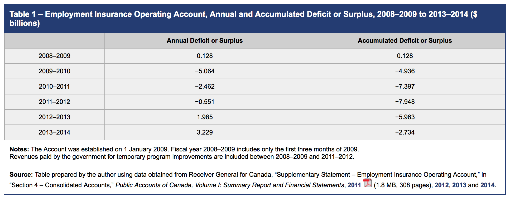 Table 1 – Employment Insurance Operating Account, Annual and Accumulated Deficit or Surplus, 2008–2009 to 2013–2014 ($ billions)