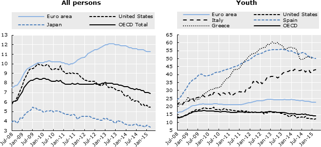 Although stable in March, since the peak of January 2013, the OECD unemployment rate for youth (people aged 15 to 24) has fallen by 2.6 percentage points, to 14.2%. Over the same period, the youth unemployment rate for the euro area declined by 1.9 percentage points, to 22.7% in March, with falls particularly significant in several euro area countries with high youth unemployment rates such as the Slovak Republic (down 9.7 percentage points, to 24.8%), Greece (down 9.5 percentage points, to 50.1% in January, the latest month available), Portugal (down 6.5 percentage points, to 33.8%) and Spain (down 5.3 percentage points, to 50.1%). However, in Italy, the youth unemployment rate rose over the period (up 4.4 percentage points, to 43.1%).