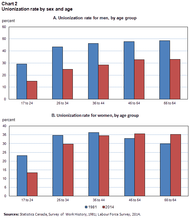The decline in the unionization rate is not a recent phenomenon. In Canada, most of the decline took place in the 1980s and 1990s. Since Statistics Canada began measuring unionization through household surveys, the rate of unionization has fallen from 37.6% in 1981 to 28.8% in 2014. Trends differ by sex, however.