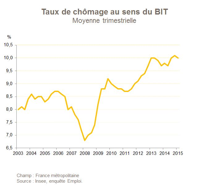 Le chiffre du chômage en France métropolitaine s’est inscrit à 10,0% au premier trimestre 2015, en baisse de 0,1% par rapport à fin 2014.