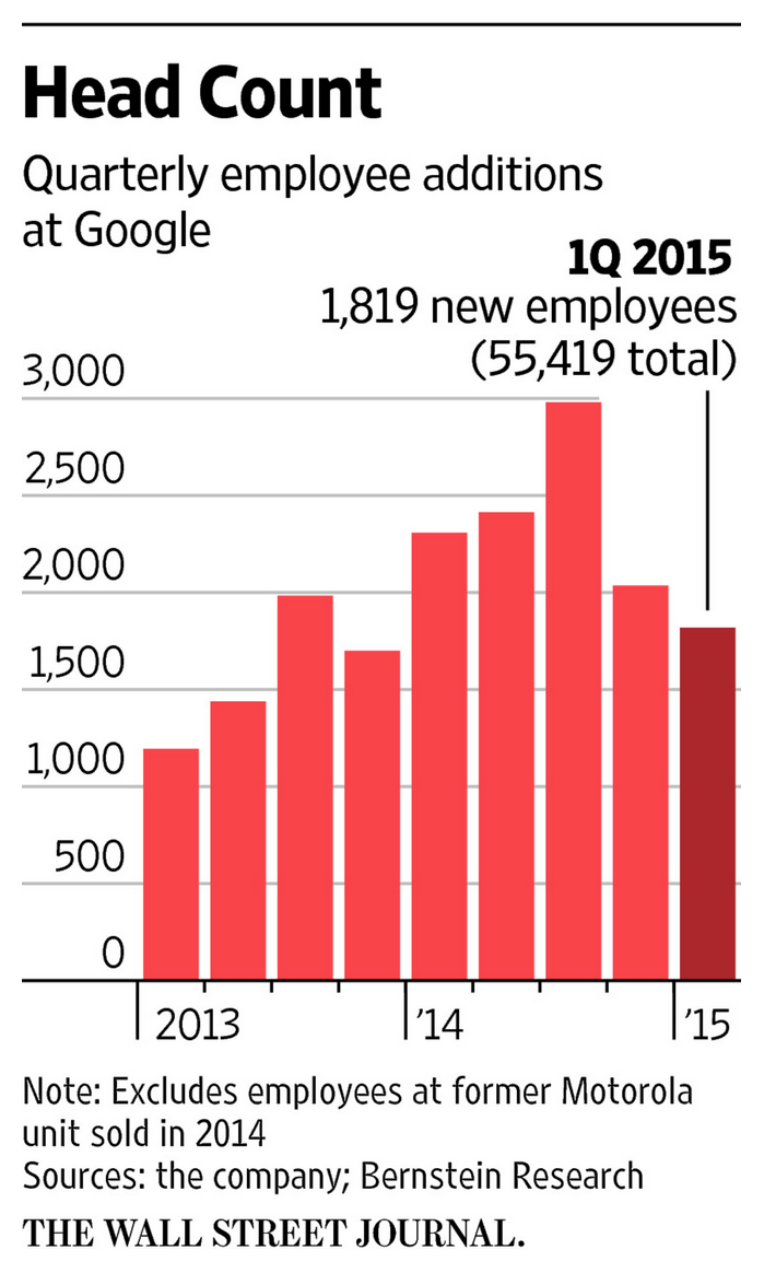 The clearest sign of the new attitude: Google added 1,819 employees in the first quarter, bringing its total to 55,419. That was the smallest increase since the final quarter of 2013; last year, Google added an average of 2,435 employees per quarter.