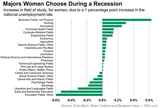 When the national unemployment rate rises by 1 percentage point, the share of women studying business rises by nearly two-thirds of a percentage point. The share of women studying nursing climbs by nearly a third of a percentage point. An additional quarter percentage point switch into accounting. Meanwhile, enrollment in education, literature and languages, sociology and psychology drops.
