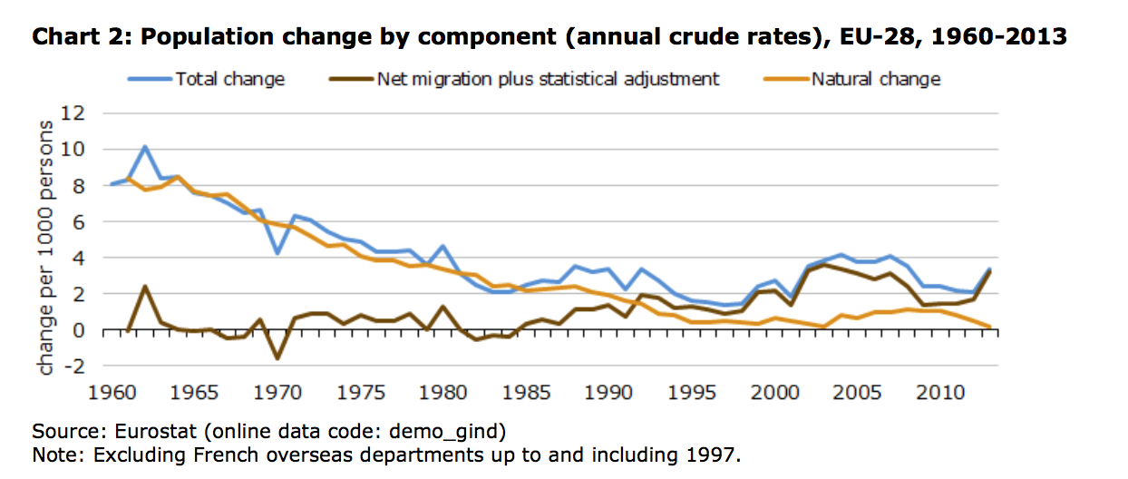In 2013, natural increase (the positive difference between live births and deaths) contributed 5% (0.08 million) to population growth in the EU-28. This means that 95% of the growth came from net migration4, which continued to be the main determinant of population growth, accounting for 1.6 million in 2013.
