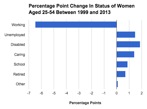 The share of prime-age adults who worked at some point during the year declined about 6.1 percentage points between 1999 and 2013 (note this differs somewhat from LFP). The share of people who did not work during the year because they could not find work (unemployed) picked up around 1.6 points. The share of people who did not work during the year because they were ill or disabled also picked up about 1.6 points. The share of people not working because they are taking care of a family (caring) picked up 1.1 points. Students picked up 1 point. Retireds picked up 0.6 points. Other picked up 0.2 points.