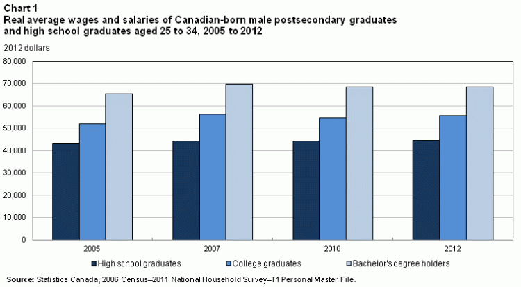 In 2005, Canadian-born male and female bachelor’s degree holders aged 25 to 34 earned on average $65,400 and $46,500 (in 2012 dollars) in wages and salaries, respectively. This was more than $20,000 higher than the earnings received by their counterparts with only a high school diploma (Table 1 and Charts 1 and 2).Note 4 While young female bachelor’s degree holders saw their earnings rise from 2005 to 2012, young male bachelor’s degree holders experienced a slight decline in real earnings from 2007 to 2010 and little change afterwards. By 2012, young male and female university graduates earned 4.9% and 8.5% more, on average, than their counterparts did in 2005.