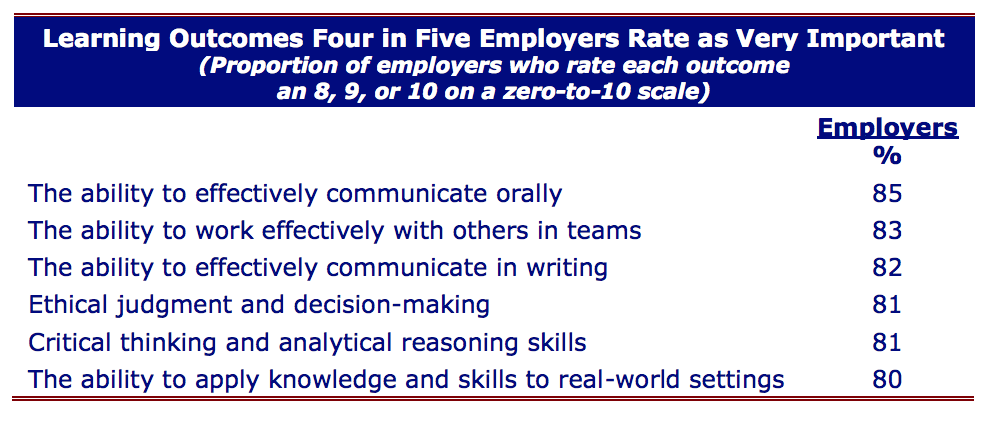 When hiring recent college graduates, employers say they place the greatest priority on a demonstrated proficiency in skills and knowledge that cut across majors. Written and oral communication skills, teamwork skills, ethical decision-making, critical thinking skills, and the ability to apply knowledge in real-world settings are the most highly valued among the 17 skills and knowledge areas tested.