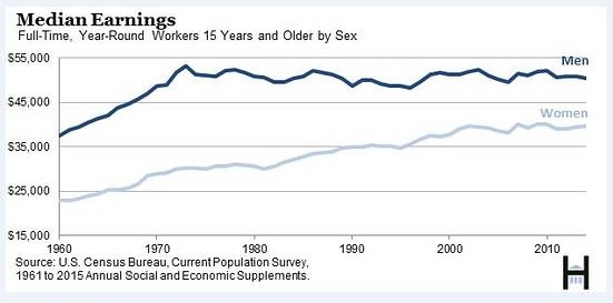 What about women? Well, they haven’t closed the pay gap with men, but the inflation-adjusted earnings of the median female worker increased more than 30% between 1973 and 2014, to $39,621 from $30,182, according to census data.