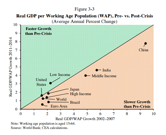 Among industrialized economies, only the U.S. and Japan are growing at similar rates compared with their precrisis growth rate after adjusting for changes in the working-age population, but their economies have still grown more slowly than expected.