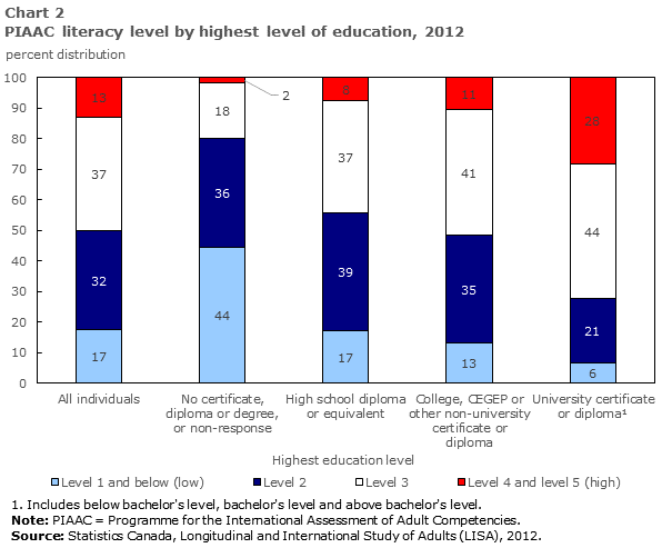 - In 2012, 17% of Canadian adults aged 16 to 65 had a literacy score corresponding to level 1 and below, meaning that they could only find single pieces of information in shorts texts or only had a basic vocabulary. About 13% were in the two highest categories of literacy skills (level 4 and level 5).