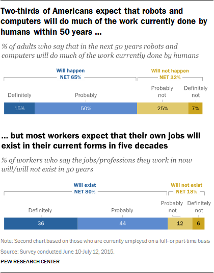 A majority of Americans predict that within 50 years, robots and computers will do much of the work currently done by humans – but few workers expect their own jobs or professions to experience substantial impacts