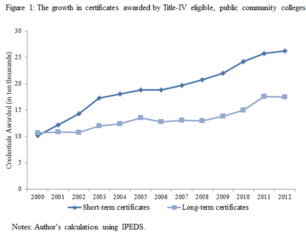 Over the past decade there has been tremendous growth in the number of short credentials awarded by public community colleges. These programs of study are explicitly vocational and require fewer credits for completion than an associate’s degree. However, it is not clear whether students benefit from obtaining these certificates. On the one hand, these credentials could be tightly coupled with local labor market needs and provide students with tangible skills that could help them get jobs. On the other hand, these short programs of study could leave students with a credential that means little to employers and offers them no clear avenue to additional schooling.