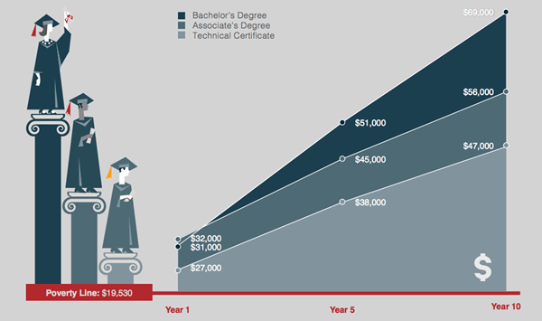 The common outcome of our current strategy—“bachelor’s degree or bust”—is that a young person drops out of college at age 20 with no post-secondary credential, no skills, and no work experience, but a fair amount of debt. That’s a terrible way to begin adult life, and it’s even worse if the young adult aims to escape poverty.