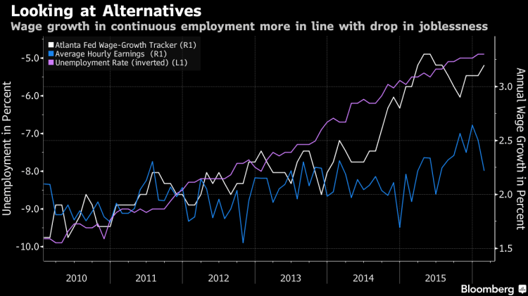“The signal is muddied so we shouldn’t use it as an indicator that the labor market is weaker than we observe when we look at the unemployment rate,” Mary Daly, associate director of research at the San Francisco Fed, said in an interview. “Absent the changes in labor-force composition, we would have seen wage growth come up more consistently with the decline of unemployment.”