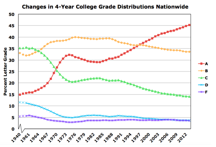 A’s were the most common grade on college campuses in 2013, accounting for 45% of grades awarded to students, according to an analysis of grade data at more than 80 schools by Stuart Rojstaczer, an independent researcher, and Chris Healy, a computer science professor at Furman University. By contrast, college students were most likely to get C’s leading up to the Vietnam War, accounting for about 35% of grades awarded. The two researchers have been collecting and reporting on grade data for years.
