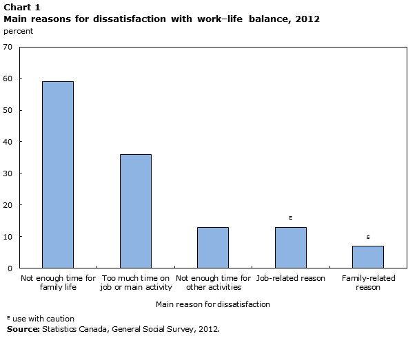 Of the parents who said that they were not satisfied, the most frequently mentioned reason for the dissatisfaction was not having enough time for family life (Chart 1). This was followed by spending too much time on their job or main activity, and not having enough time for other activities.Women were a little less likely than men to be satisfied. Specifically, 72% of mothers reported that they were satisfied or very satisfied with their work-life balance, compared with 78% of fathers.