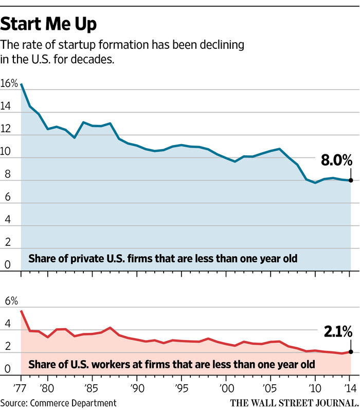 But government data shows a decadeslong slowdown in entrepreneurship. The share of private firms less than a year old has dropped from more than 12% during much of the 1980s to only about 8% since 2010. In 2014, the most recent year of data, the startup rate was the second-lowest on record, after 2010, according to Census Bureau figures released last month, so there’s little sign of a postrecession rebound.
