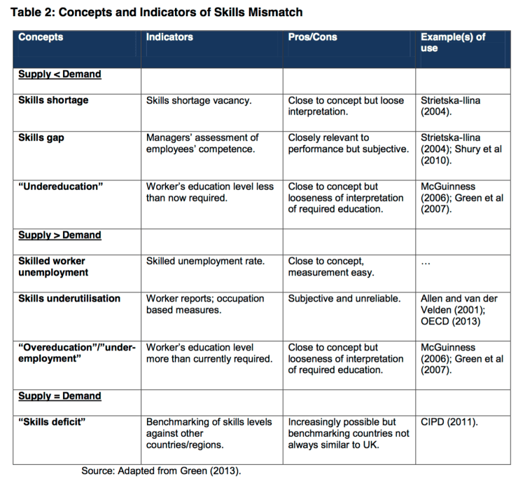 Table 2, adapted from Green (2013), summarises the different concepts that have come under the general term “skills mismatch”. The variety itself makes the point that clarity of meaning is going to be important.