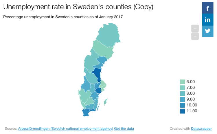 The variation in unemployment rate between Sweden’s 21 counties can be observed at a glance with the interactive map below.