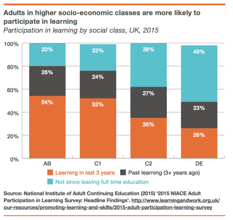 • The training system has failed to tackle regional and social inequalities. Adults who stand to bene t most from training are the least likely to participate. The adult skills system has failed to support regions scarred by deindustrialisation, and it has failed to address stark regional disparities in economic performance. The apprenticeship levy may accentuate regional skills inequalities by boosting investment most in London and the south east.