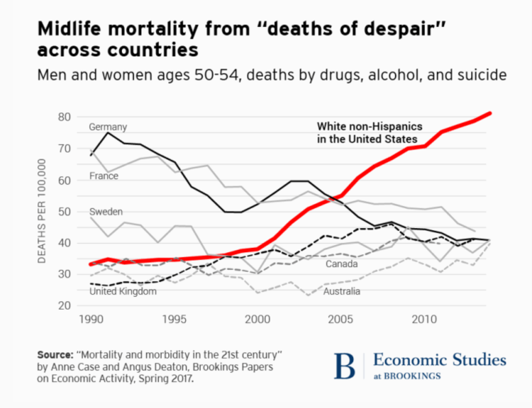 Chosen excerpts by Job Market Monitor. Read the whole story at Working class white Americans are now dying in middle age at faster rates than minority groups | Brookings Institution