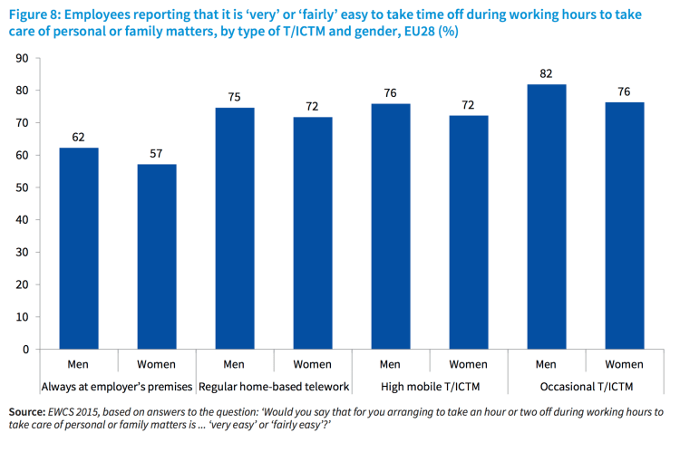 Regarding the positive effects of T/ICTM, workers report a reduction in commuting time, greater working time autonomy leading to more flexibility in terms of working time organisation, better overall work–life balance, and higher productivity. Companies benefit from the improvement in work–life balance, which can lead to increased motivation and reduced turnover as well as enhanced productivity and efficiency, and from a reduction in the need for office space and associated costs. The disadvantages of T/ICTM are the tendency to lead to longer working hours, to create an overlap between paid work and personal life (work–home interference), and to result in work intensification. Home-based teleworkers seem to report better work– life balance, while ‘high-mobile’ workers are more at risk of negative health and well-being outcomes. Partial and occasional forms of T/ICTM appear to result in a more positive balance between the benefits and drawbacks. From a gender perspective, women doing T/ICTM tend to work shorter hours than men, and women seem to achieve slightly better work–life balance effects.