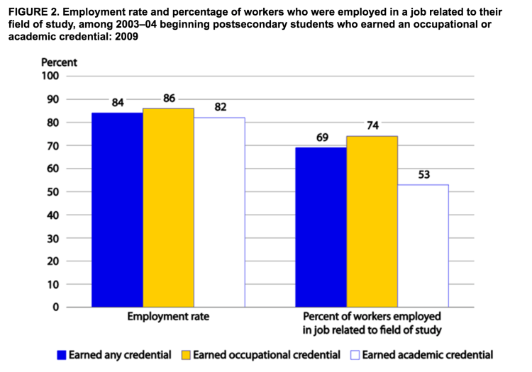 In 2009, about 74 percent of employed completers with an occupational credential reported that their job was related to their field of study, compared to 53 percent of employed completers ith an academic credential (figure 2).