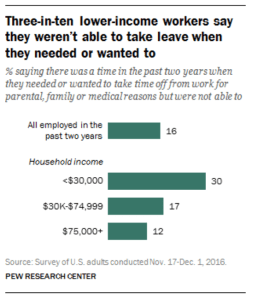 leave at some point (62%), but many, particularly among lower-income workers, aren’t able to take time off from work when these situations arise, according to a new Pew Research Center study.