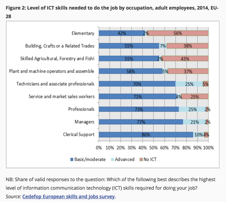 Cedefop’s European skills and jobs (ESJ) survey reveals that more than 7 in 10 adult employees in the EU need at least some fundamental ICT level to be able to perform their jobs. Yet, about one in three of those employees are at risk of digital skill gaps. At the same time, almost half of all employees in low-skilled occupations do not require ICT skills to do their work. Cedefop expert @K_Pouliakas notes that ‘the digital divide is alive and well. A strikingly high share of the EU adult workforce is still employed in a semi-analogue world, at the same time that others are faced with technological obsolescence. Reaping the full benefits of digitalisation will require modernisation of education and training systems but, crucially, more investment in digital capital infrastructure and continuing online learning for groups excluded from the digital economy.’