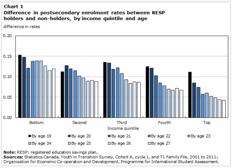 In addition, the study finds that having access to an RESP account at age 15 was associated with higher postsecondary enrolment rates by age 19, independent of family income. The gap in postsecondary enrolment rates between RESP holders and non-holders declined over time in all income quintiles. By age 27, the association between RESPs and enrolment was still positive across the income distribution, but it was statistically significant only for youth in the second, third and fourth income quintiles. A positive association between RESP use and postsecondary enrolment was also found among boys and girls, both in the short term and in the long term; however, the association was about twice as strong among boys.