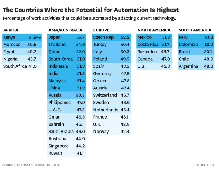 Chosen excerpts by Job Market Monitor. Read the whole story at The Countries Most (and Least) Likely to be Affected by Automation